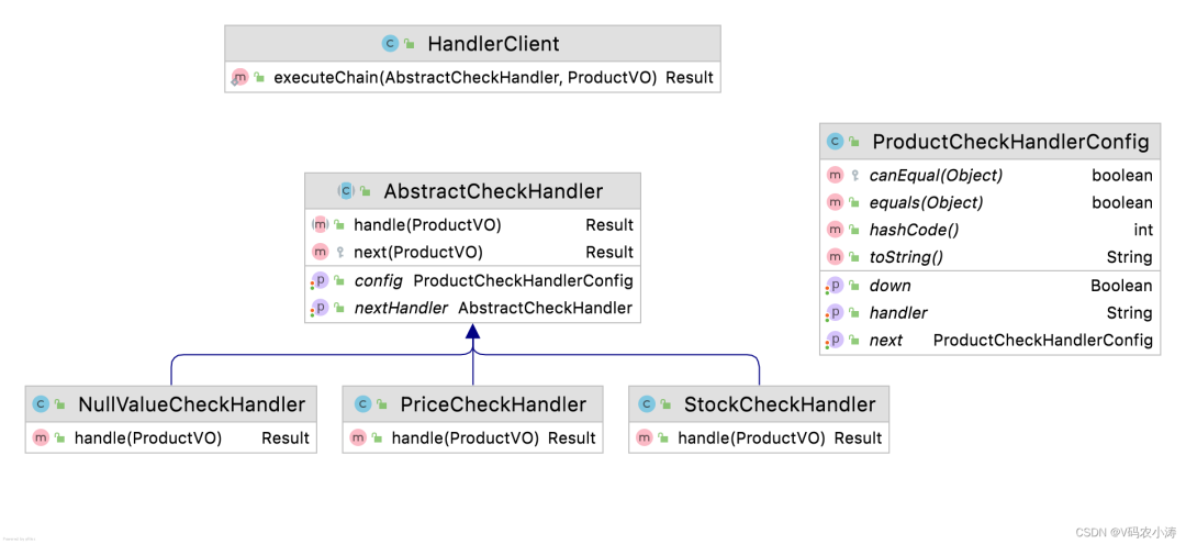 protected ProductCheckHandlerConfig config 是处理器的动态配置类,使用protected声明,每个子类处理器都持有该对象。该对象用于声明当前处理器、以及当前处理器的下一个处理器nextHandler,另外也可以配置一些特殊属性,比如说接口降级配置、超时时间配置等。