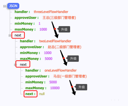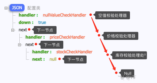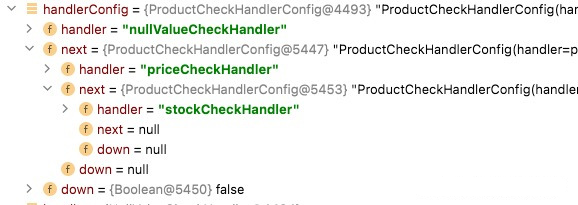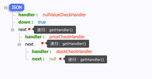 String configJson = "{\"handler\":\"nullValueCheckHandler\",\"down\":true,\"next\":{\"handler\":\"priceCheckHandler\",\"next\":{\"handler\":\"stockCheckHandler\",\"next\":null}}}";