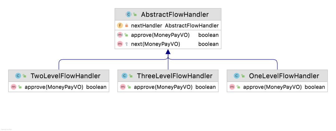 AbstractFlowHandler作为处理器抽象类,抽象了approve()审核方法,一级、二级、三级部门管理者处理器继承了抽象类,并重写其approve()审核方法,从而实现特有的审核逻辑。