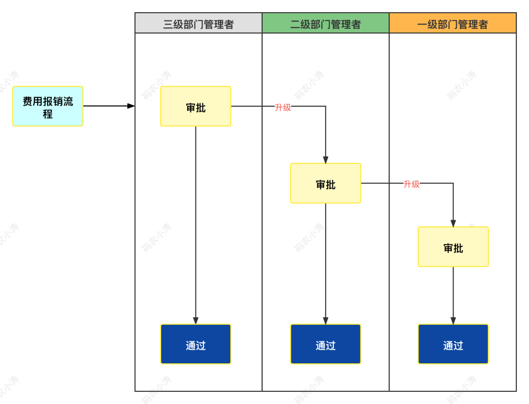 同事小贾最近刚出差回来,她迫不及待的就提交了费用报销的流程。根据金额不同,分为以下几种审核流程。报销金额低于1000元,三级部门管理者审批即可,1000到5000元除了三级部门管理者审批,还需要二级部门管理者审批,而5000到10000元还需要一级部门管理者审批。即有以下几种情况: