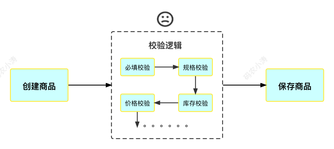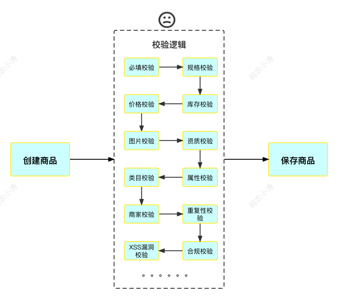 第②步校验商品又分为多种情况的校验,必填字段校验、规格校验、价格校验、库存校验等等。这些检验逻辑像一个流水线,要想创建出一个商品,必须通过这些校验。如下流程图所示: