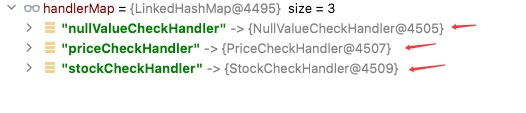 注入进来的handlerMap中 Map的Key对应Bean的name,Value是name对应的Bean实例,也就是实际的处理器,这里指空值校验处理器、价格校验处理器、库存校验处理器。如下: