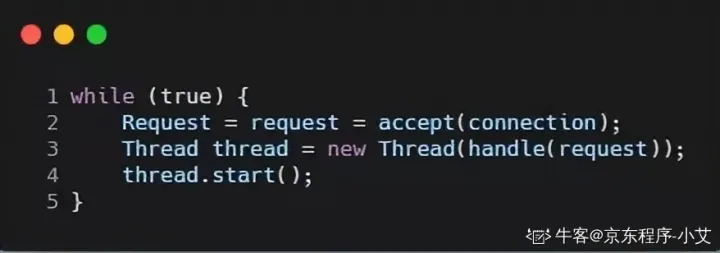 如上述代码所示:同上还是一个 while 循环不断的 accept 生产者提交上来的请求,但是这时候 Kafka 系统会为每个请求都创建一个「单独的线程」来处理。