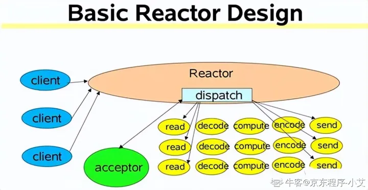 在高性能网络编程领域,有一个非常著名的模式——Reactor模式。那么何为「Reactor模式」,首先它是基于事件驱动的,有一个或多个并发输入源,有一个Service Handler,有多个Request Handler;这个Service Handler会同步的将输入的请求轮询地分发给相应的Request Handler进行处理。