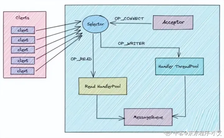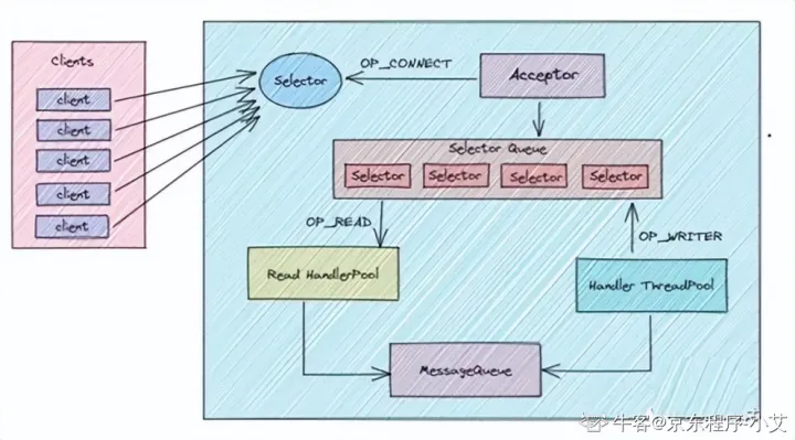 接下来,我们将进一步进行优化,为了减轻当前 Selector 的处理负担,引入另外一个Selector 处理队列,如下图所示: