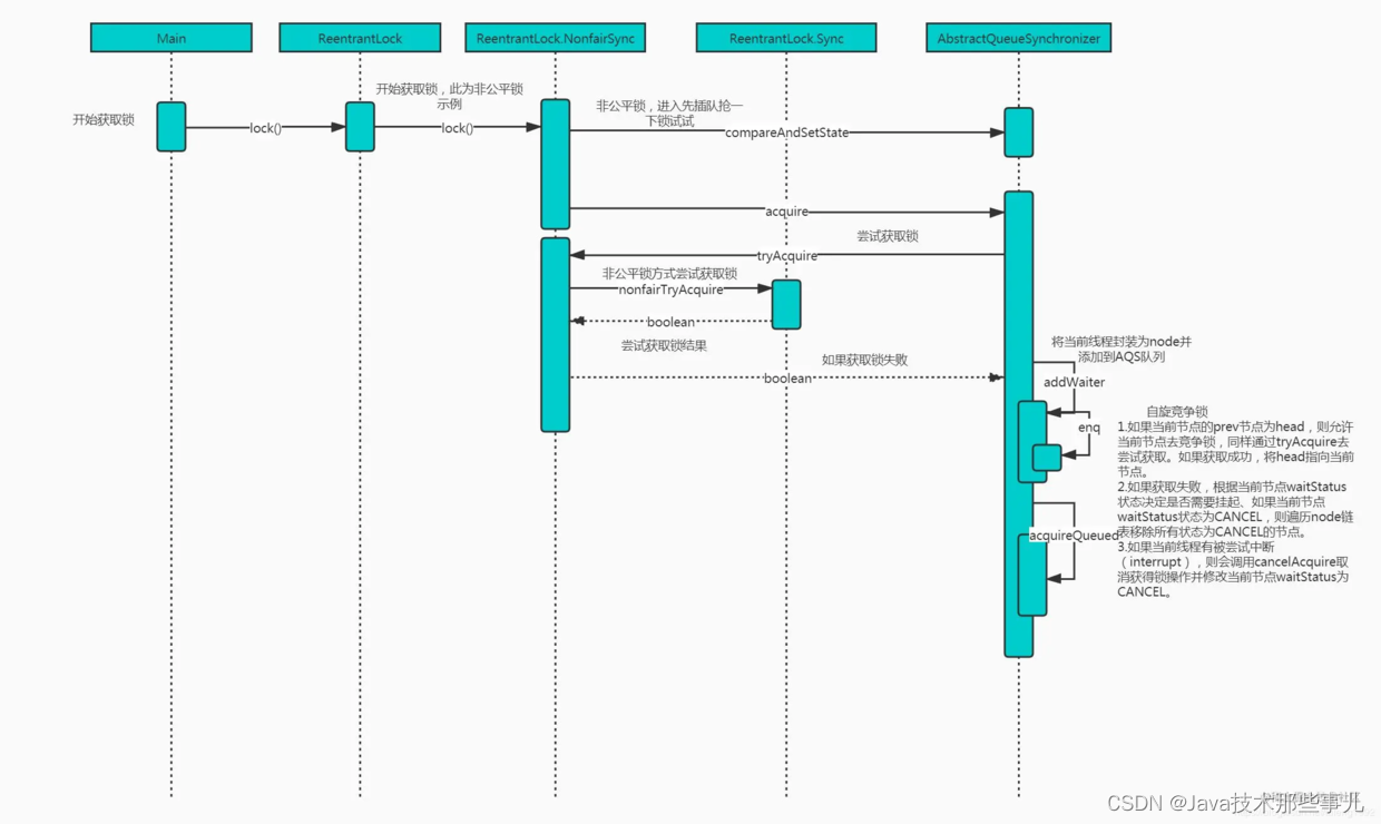 调用 ReentrantLock 中的 lock() 方法,源码的调用过程我使用了时序图来展现。