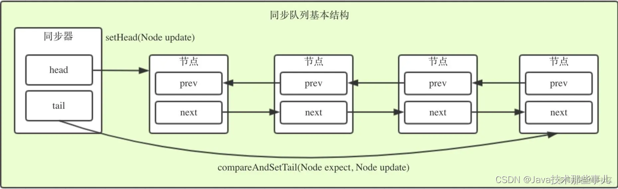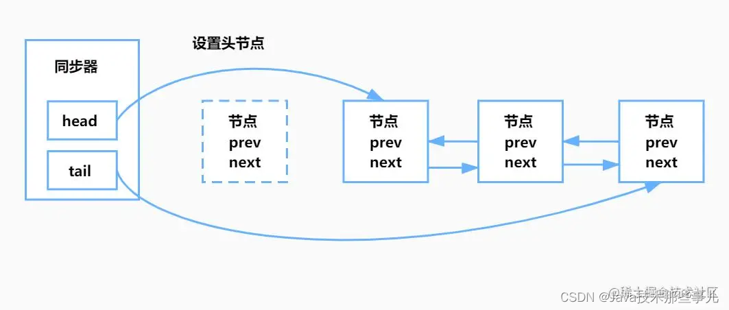 设置 head 节点不需要用 CAS,原因是设置 head 节点是由获得锁的线程来完成的,而同步锁只能由一个线程获得,所以不需要 CAS 保证,只需要把 head 节点设置为原首节点的后继节点,并且断开原 head 节点的 next 引用即可