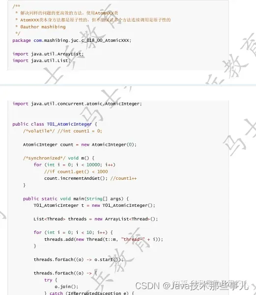像原来我们写m++你得加锁,在多线程访问的情况下,那现在我们可以用Atomicinteger了,它内部就已经帮我们实现了原子操作。直接写count. incrementAndGet(: /count1++这个就相当于count++.原来我们对count是需要加锁的, 现在就不需要加锁了。