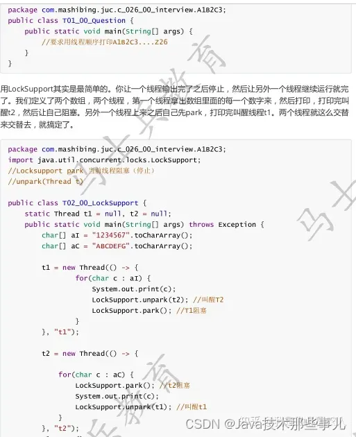 这道面试题呢实际上是华为的一-道面试题,其实它里面是一道填空题 ,后来就很多的开始考这道题,这个面试题是两个线程,第一个线程是从1到26 ,第二个线程是从A到- -直到Z ,然后要让这两个线程做到同时运行,交替输出,顺序打印。那么这道题目的解法有非常多。