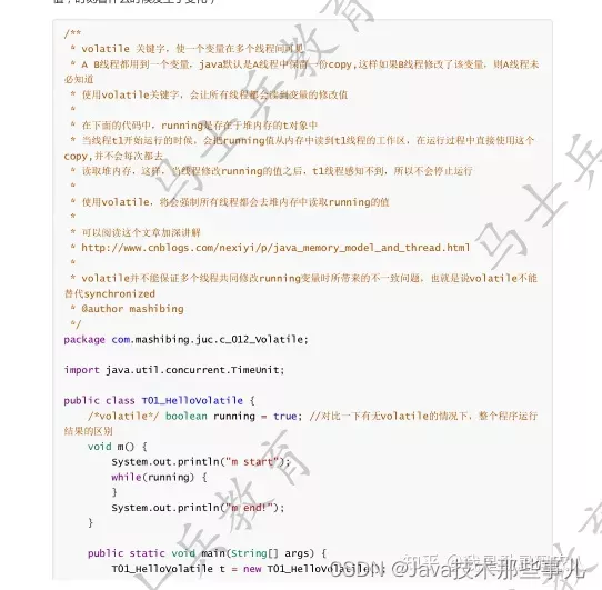 我们来看一下这个小程序,写了-一个方法啊,首先定义了-个变布尔类型等于true ,这里模拟的是一个服务器的操作,我的值为true你就给我不间断的运行,什么时候为false你再停止。测试new Thread启动-个线程,调用m方法,睡了-秒,最后running等于false ,运行方法他是不会停止的。如果你要把volatile打开,那么结果就是启动程序-秒之后他就会m end停止。( volatile就是不停的追踪这个值,时刻看什么时候发生了变化)