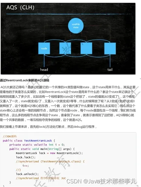 今天咱们继续讲AQS的源码,在上节课我教大家怎么阅读AQS源码。跑不起来的不读。解决问题就好一目的性。- -条线索到底、无关细节略过,读源码的时候应该先读骨架,比如拿AQS来说,你需要了解AQS是这么一一个数据结构,你读源码的时候读起来就会好很多, 在这里需要插-句,从第一章到本章,章章的内容都是环环相扣的,没学习前边,建议先去补习- -下前面的章节。
