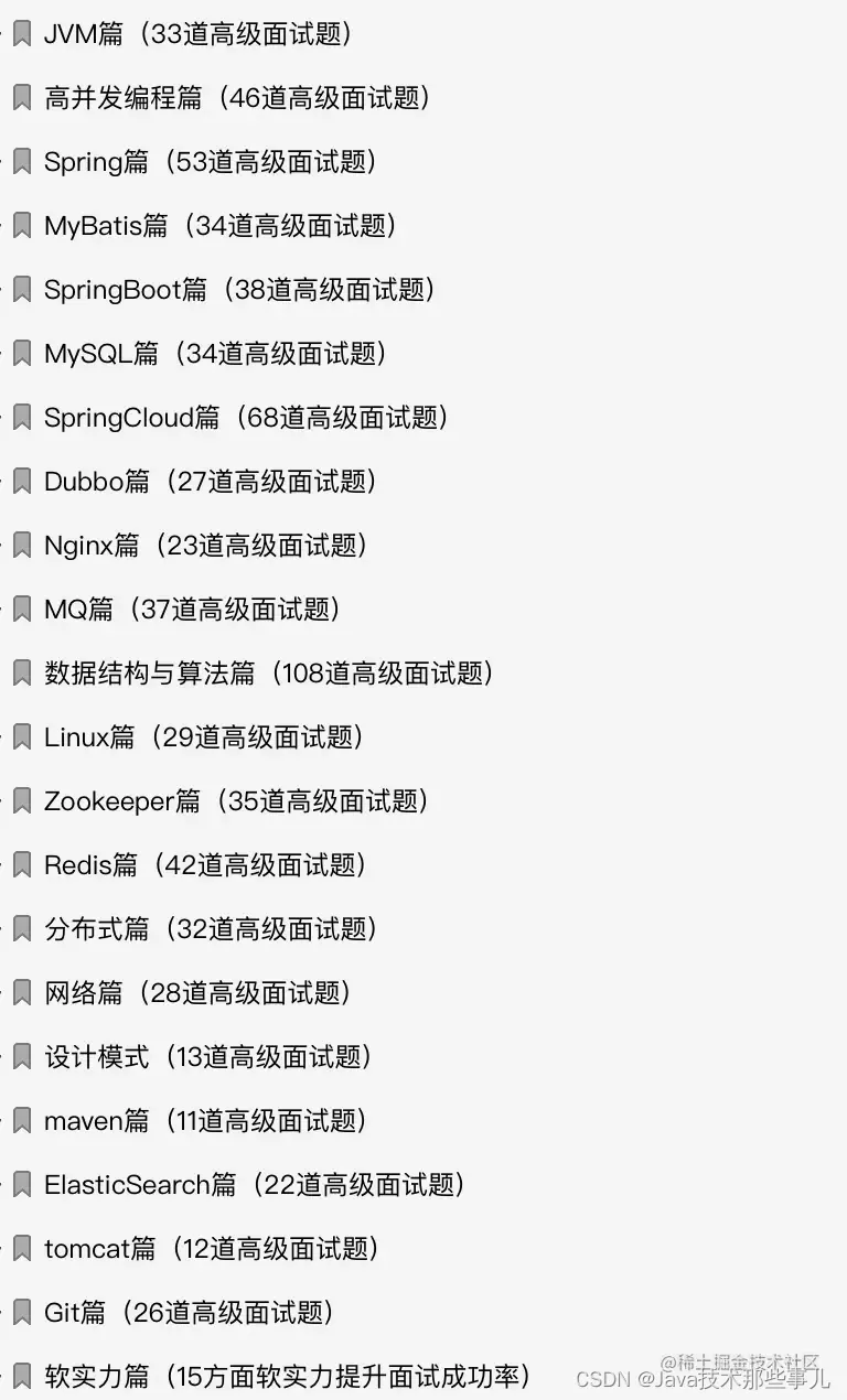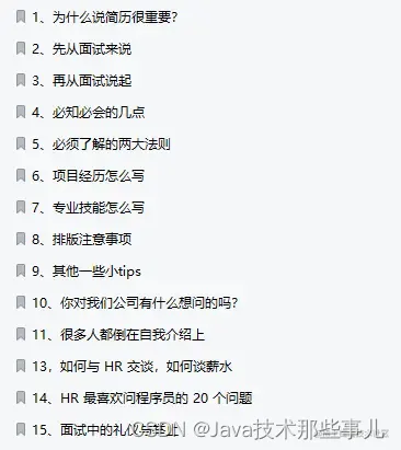 同时从阿里离职之后也带走了这一套java高级面试题解析!全篇共计751道阿里内部的面试题以及15个面试大厂的核心技巧! 下面为大家展示的是章节目录供大家参考学习!