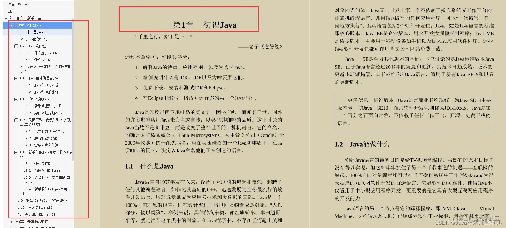 Java是世界上第一个100%不依赖操作系统平台、面向对象的编程语言。在从发布、发展到成熟、壮大的20多年里,Java如同 一颗冉冉升起的耀眼明星,迅速超越C和C++,独占鳌头,成为软件开发最广泛应用的编程语言之一。恭贺你选择了Java,感谢你翻开这本书,它可以作为启迪你Java编程概念的向导、打开通往Java技术宝库的“金钥匙”。这无疑会使你与Java结下不解之缘,成为掌握和拥有Java技术大家庭中的一员。