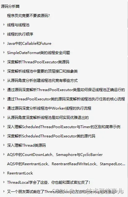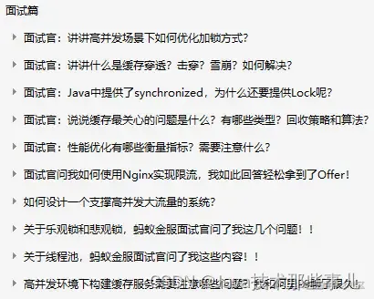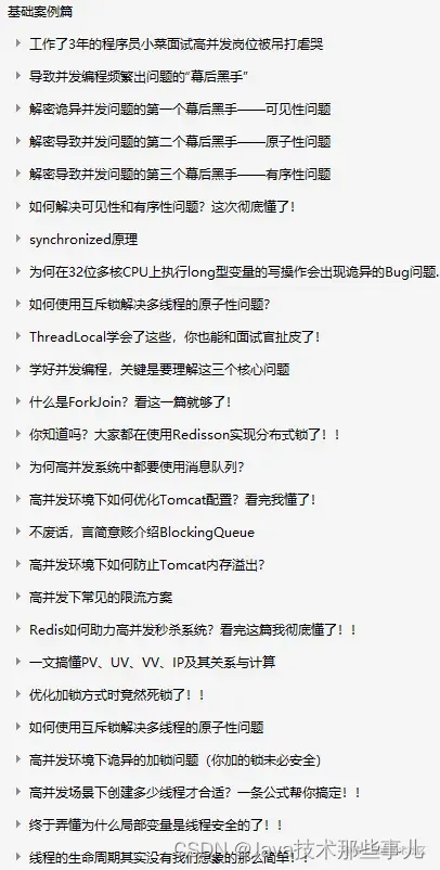 为了帮助大家能够快速上手高并发,这里给大家推荐这份《Java进阶必备技能:JUC并发编程》。手册深入JUC并发编程与源码分析,对标阿里P6-P7,庖丁解牛式讲解,案例驱动,即给方法又给方案,大厂面试真题剖析,应有尽有,全面提升你的高并发多线程设计能力!由于两份文档一共有315页,篇幅限制肯定不能全部为大家展示出来请见谅