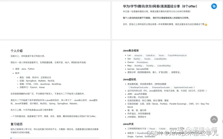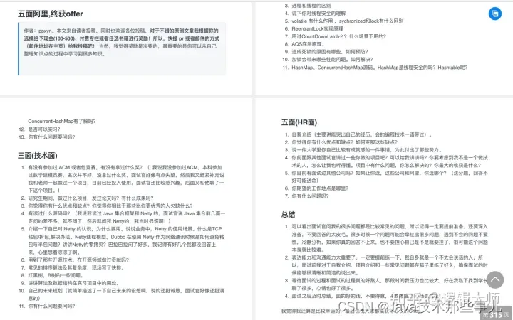 该文章提供了阿里巴巴面试的全面准备指南,涵盖Java基础、集合、多线程、JVM、计算机网络、数据库、常用框架如Spring等的面试题总结,还包括系统设计、微服务和真实面试经历,旨在帮助求职者成功通过大厂面试。