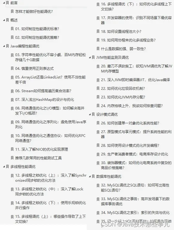 Java 性能调优包含:Java编程调优、多线程调优、JVM调优、设计模式调优、数据库性能调优,每个层级都会遇到不同的问题。这份笔记带你从实战出发,精选高频性能问题,透过Java 底层源码,提炼出优化思路和实现原理,形成一套学完即用的调优方法论。