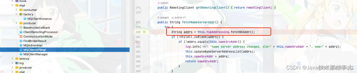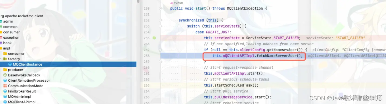 我们继续向下看 发现在product启动这里会去通过clientConfig获取namesrvAddr,如果我们之前的代码里面没有设置namesrvAddr的地址,那这里就会为空,然后就通过fetchNameServerAddr去获取namesrvAddr的地址