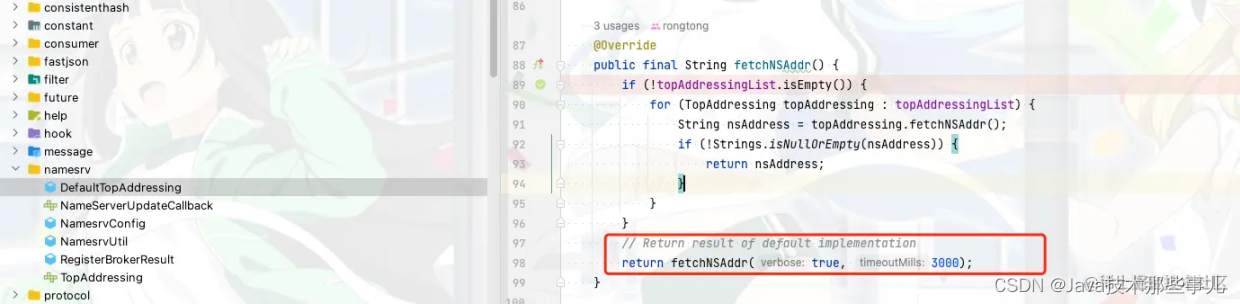 通过DefaultMQProducer的构造方法我们可以看到namesrvAddr的默认值是通过NameServerAddressUtils.getNameServerAddresses()
