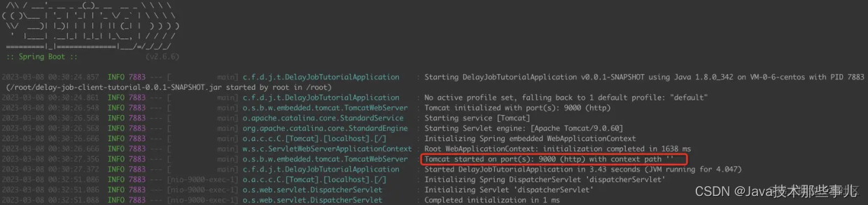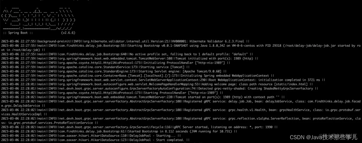观察log/delay-job.log日志信息,确认服务正常启动,成功监听1989(http)、1990(grpc)端口。