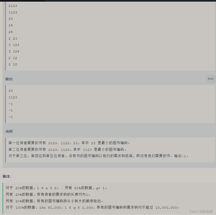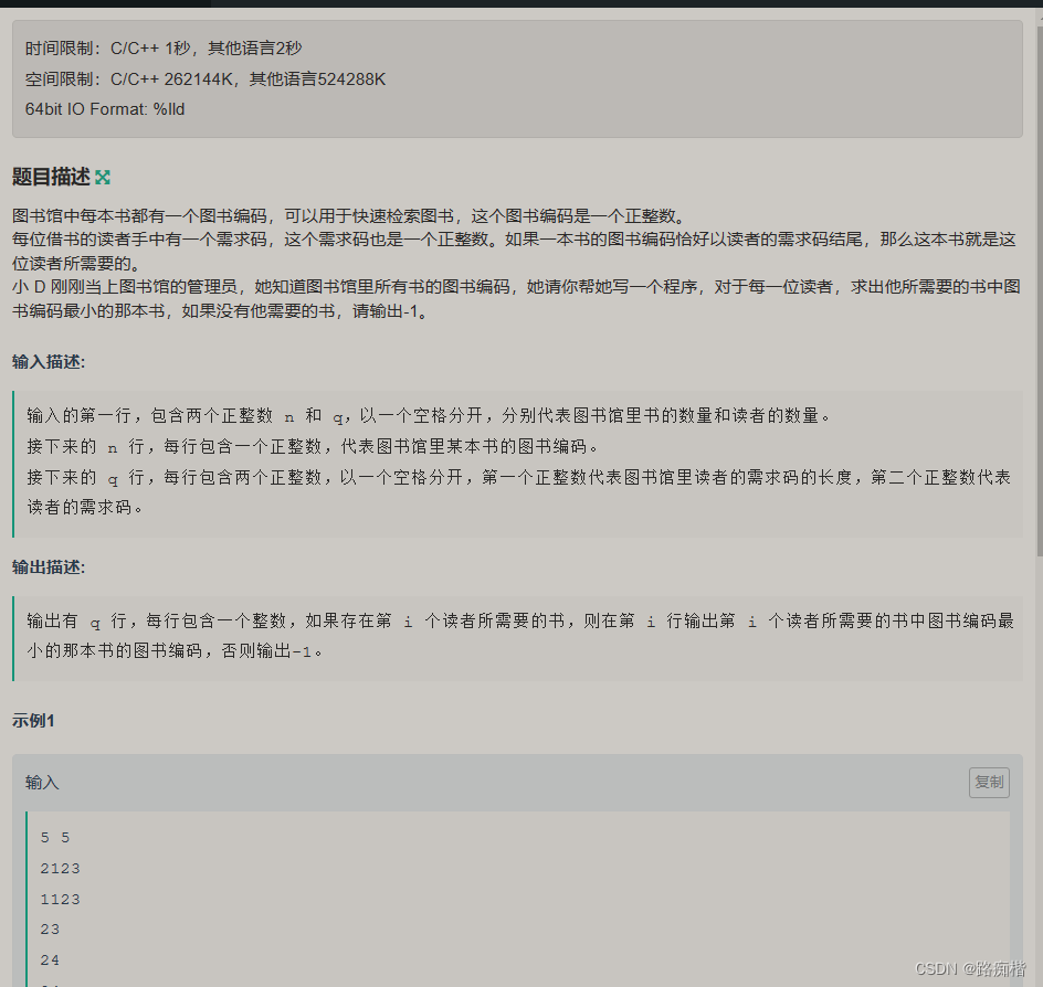 这是一个C语言实现的程序,使用结构体数组处理图书编码和读者请求的编码长度及尾号。程序读取图书编码,对读者的查询进行遍历,查找匹配的编码并返回最小值。当没有找到匹配项时,输出-1。