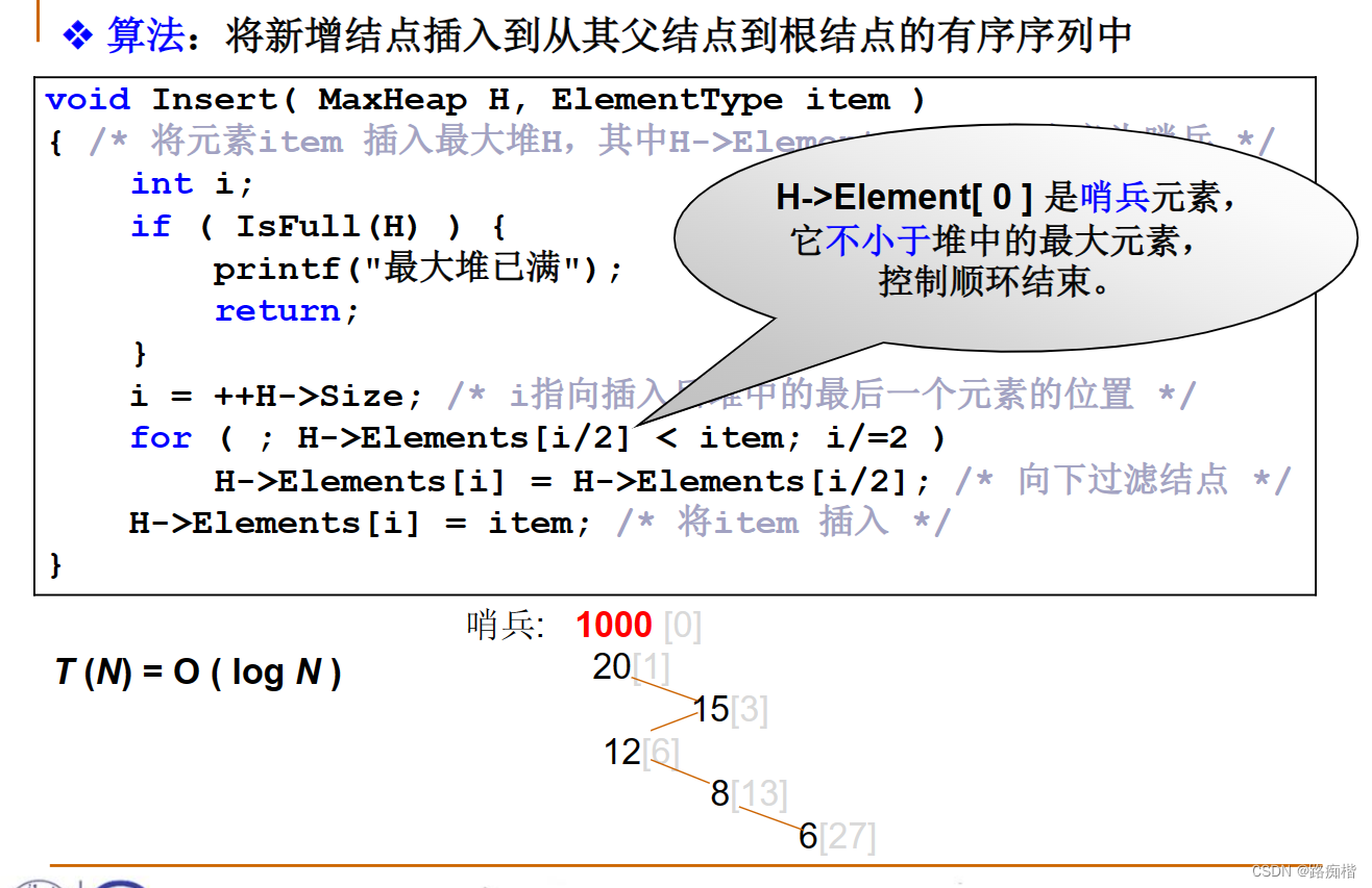将H[0]设置为填入数据的最大值,那么我们只需要比较每个节点跟填入数据的大小,若比他小则让空的数组空间储存这个值,直观表现为将原来的节点下降一个度,直至出现比填入数据大的值为止(若整棵树的最大节点仍小于所要填入的节点时,因为我们设定了H[0]是最大的数值,所以插入的数最终只能存储到H[1]