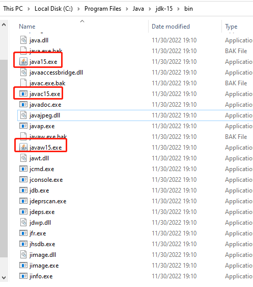 还没完,还需要进入java15的安装目录下,找到bin目录,把里面的java.exe、javac.exe、javaw.exe全改成*15.exe。