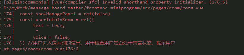 我在用uniapp开发微信小程序时遇到了一个报错,这里的问题是典型的 JavaScript对象语法错误,在vue对象字面量({})中错误的使用了赋值运算符=,而正确的语法应该是使用:定义属性。