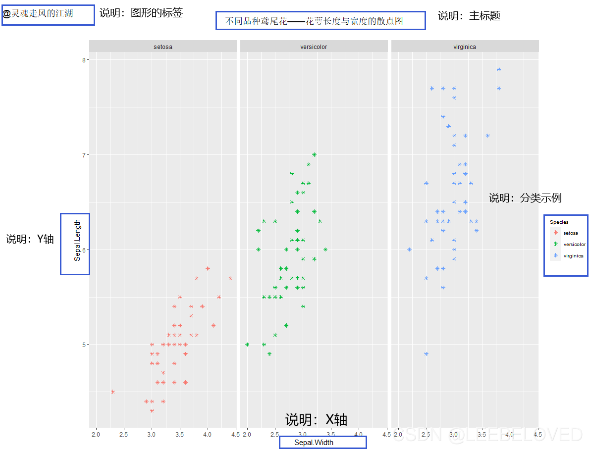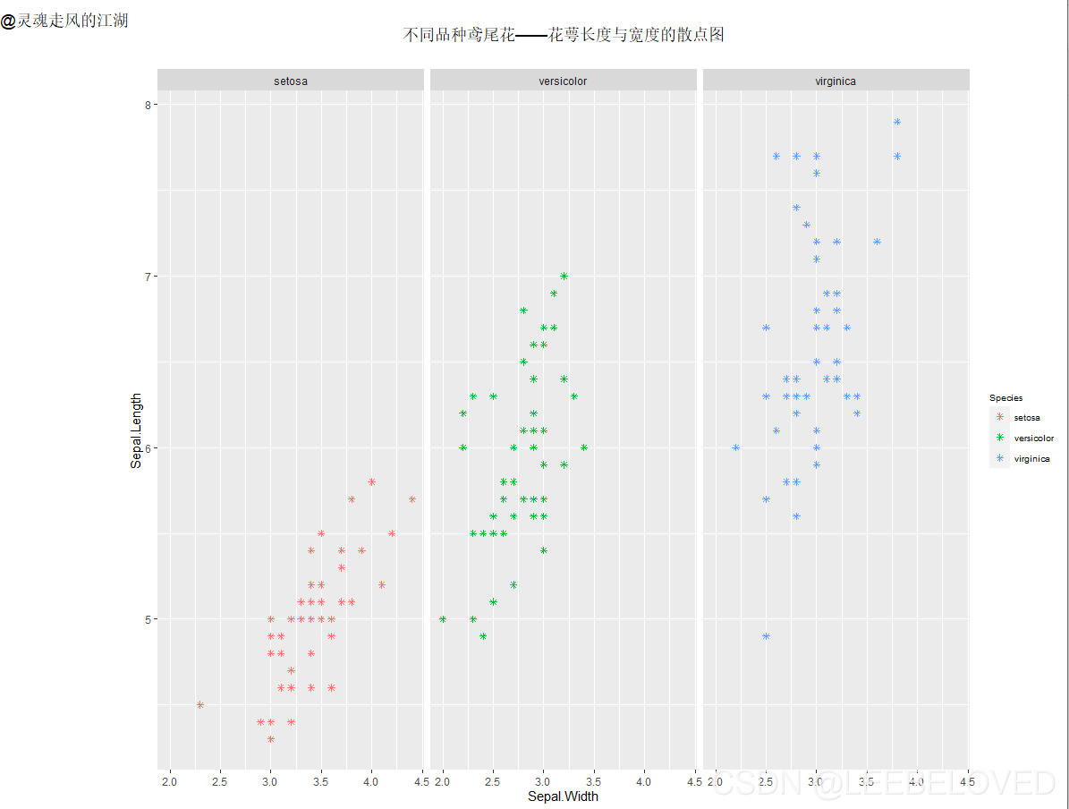 labs(title="不同品种鸢尾花——花萼长度与宽度的散点图",tag="@灵魂走风的江湖",subtitle="")