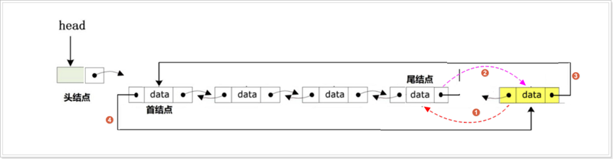 A. 将新节点的next指针指向链表头节点,将链表尾节点的next指针指向新节点