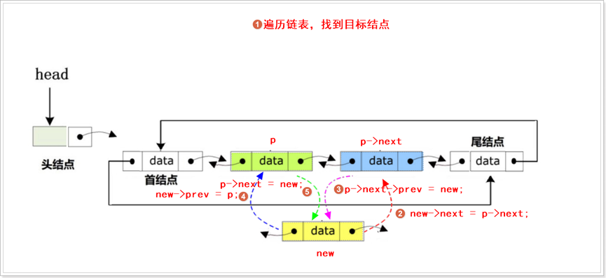 对于一个双向循环链表,如何在指定位置插入一个新节点?