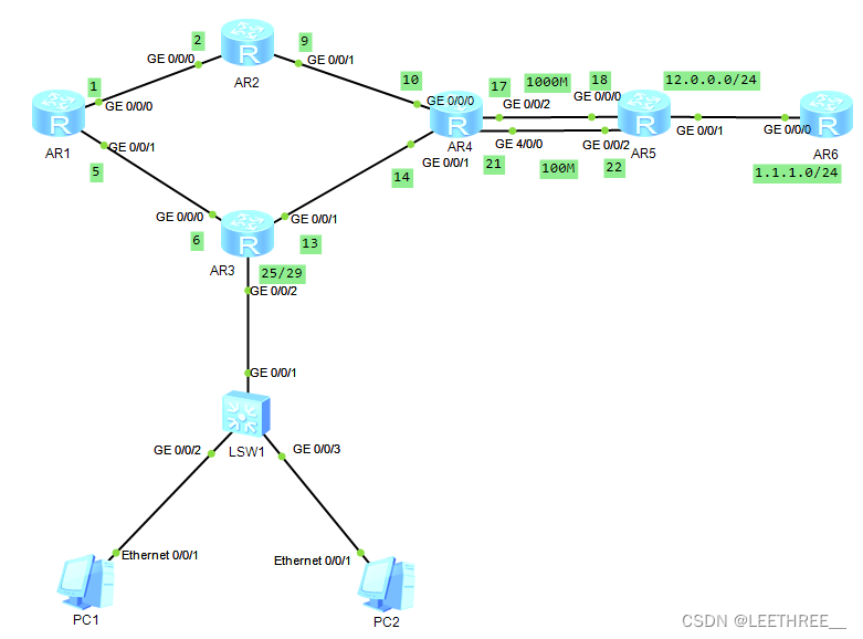 3、R1,R2,R4,各有两个环回地址;R5,R6各有一个环回地址;所有路由器上环回均代表连接用户的接口;