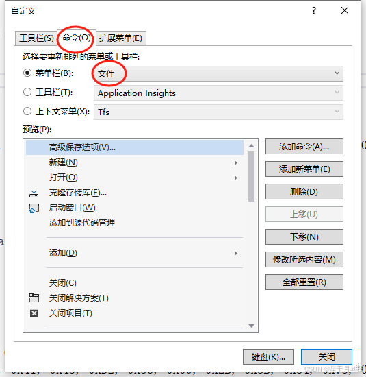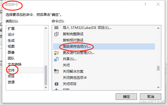 3:点击添加命令,下滑到最下面,点击文件,点击高级保存选项,把这个命令添加上。