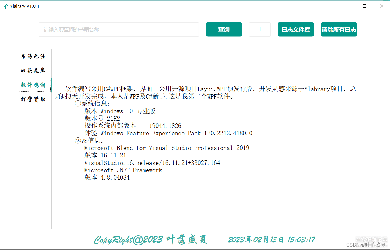 3.软件鸣谢界面,此界面记录我的一些完稿想说的话。