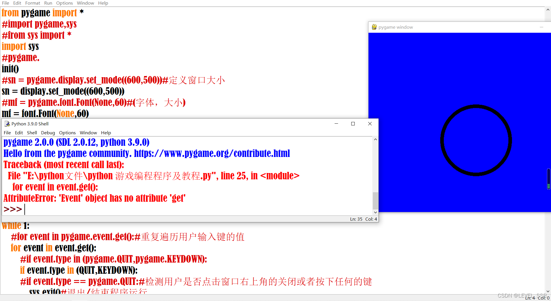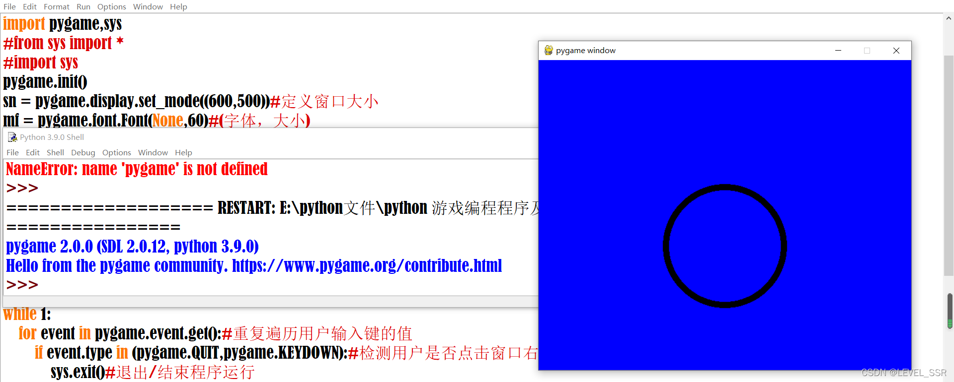 这里分别设置了圆的颜色,位置(注:pygame的(0,0)在左上角),半径及其宽度,sn在这段程序外就设置了,这样是为了使其在打开的窗口内显示。