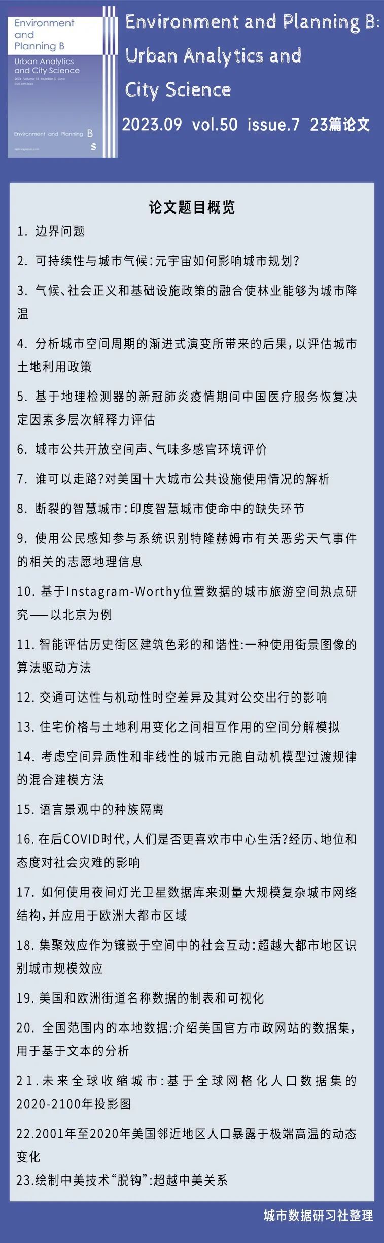 本次给大家整理的是《Environment and Planning B: Urban Analytics and City Science》杂志2023年9月第50卷第7期的论文的题目和摘要,一共包括23篇SCI论文!