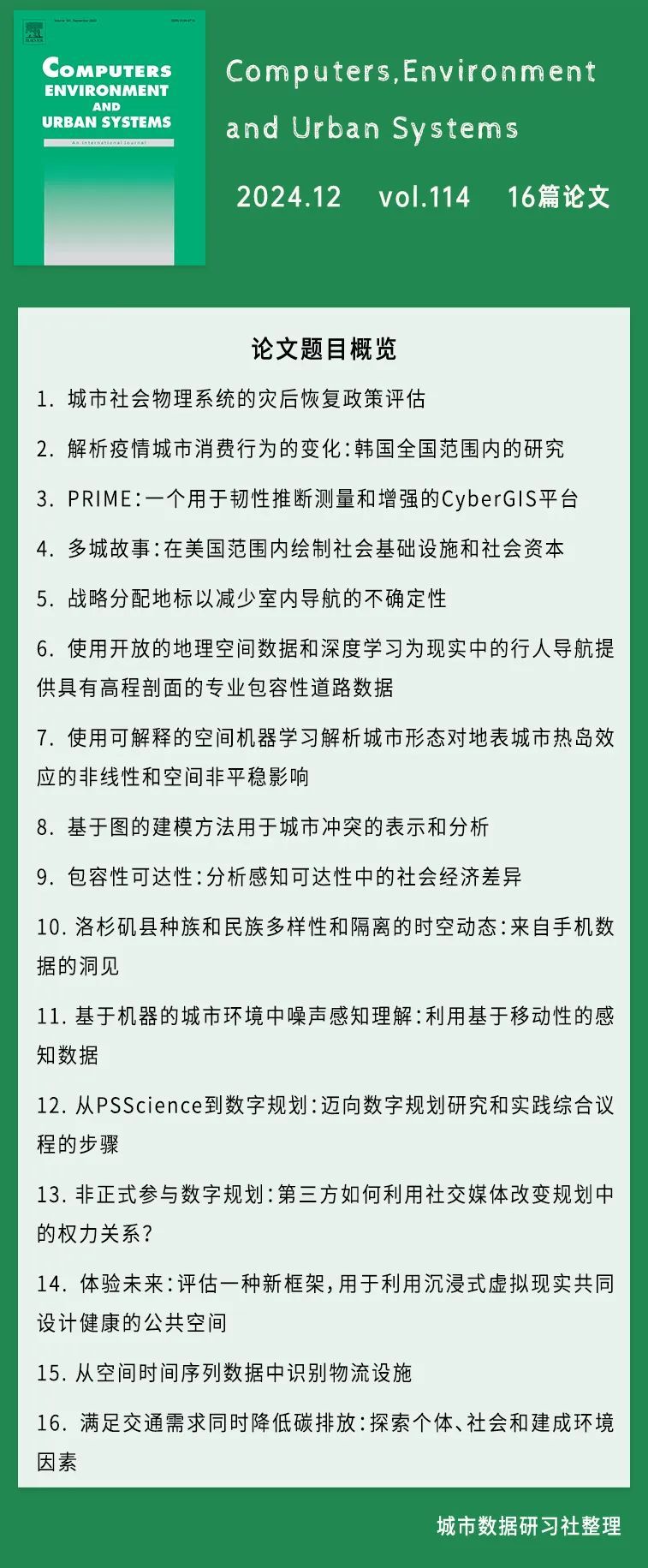 本次给大家整理的是《Computers, Environment and Urban Systems》杂志2024年12月第114期的论文的题目和摘要,一共包括16篇SCI论文!