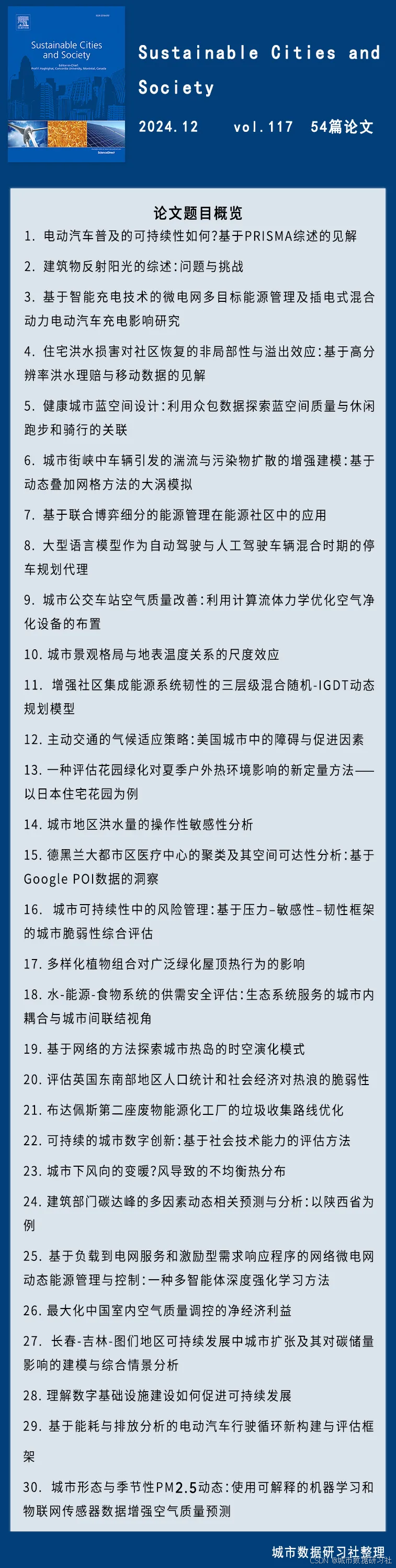本次给大家整理的是《Sustainable Cities and Society》杂志2024年12月第117期的论文的题目和摘要,一共包括54篇SCI论文!分成两部分展示。