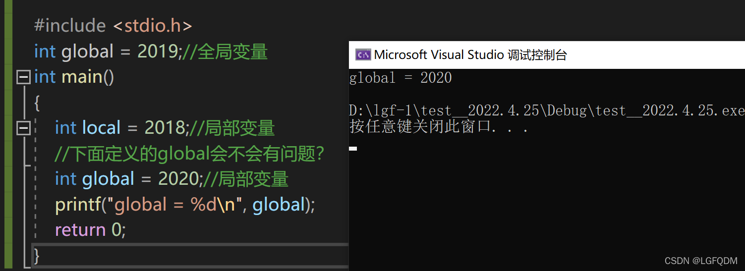 我们都知道局部变量在进代码块时创建出去时销毁,所以不难看出其作用域是变量所在的局部范围,生命周期是:进入作用域生命周期开始,出作用域生命周期结束。