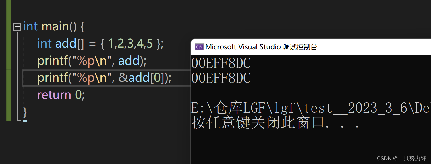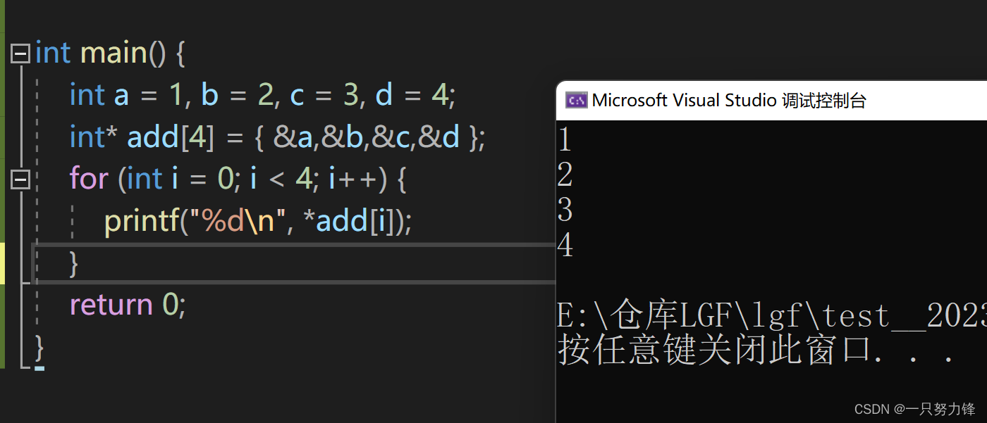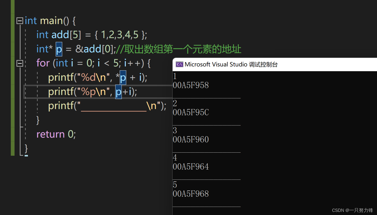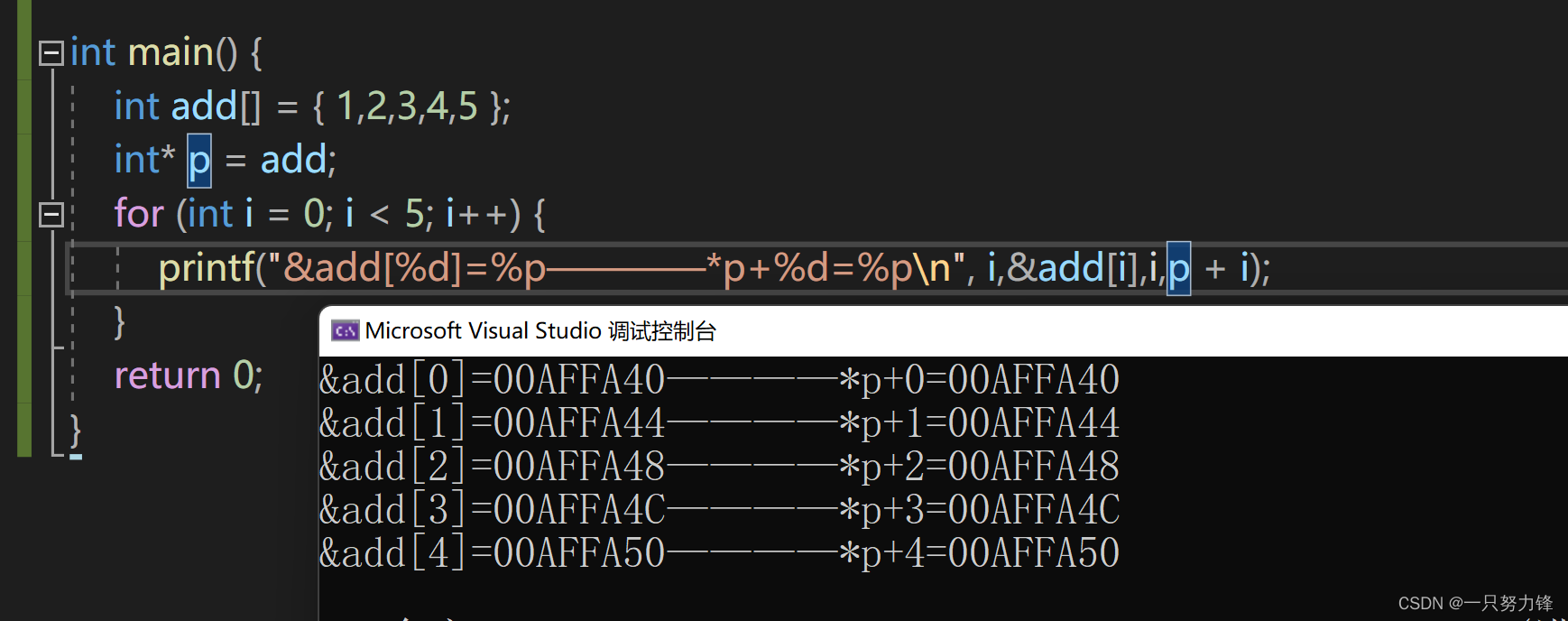 我们可以看到指针所指向的地址正是数组对应元素的地址,说明可以用指针来访问数组。 所以 p+i 其实计算的是数组 arr 下标为i的地址,那我们就可以直接通过指针来访问数组。