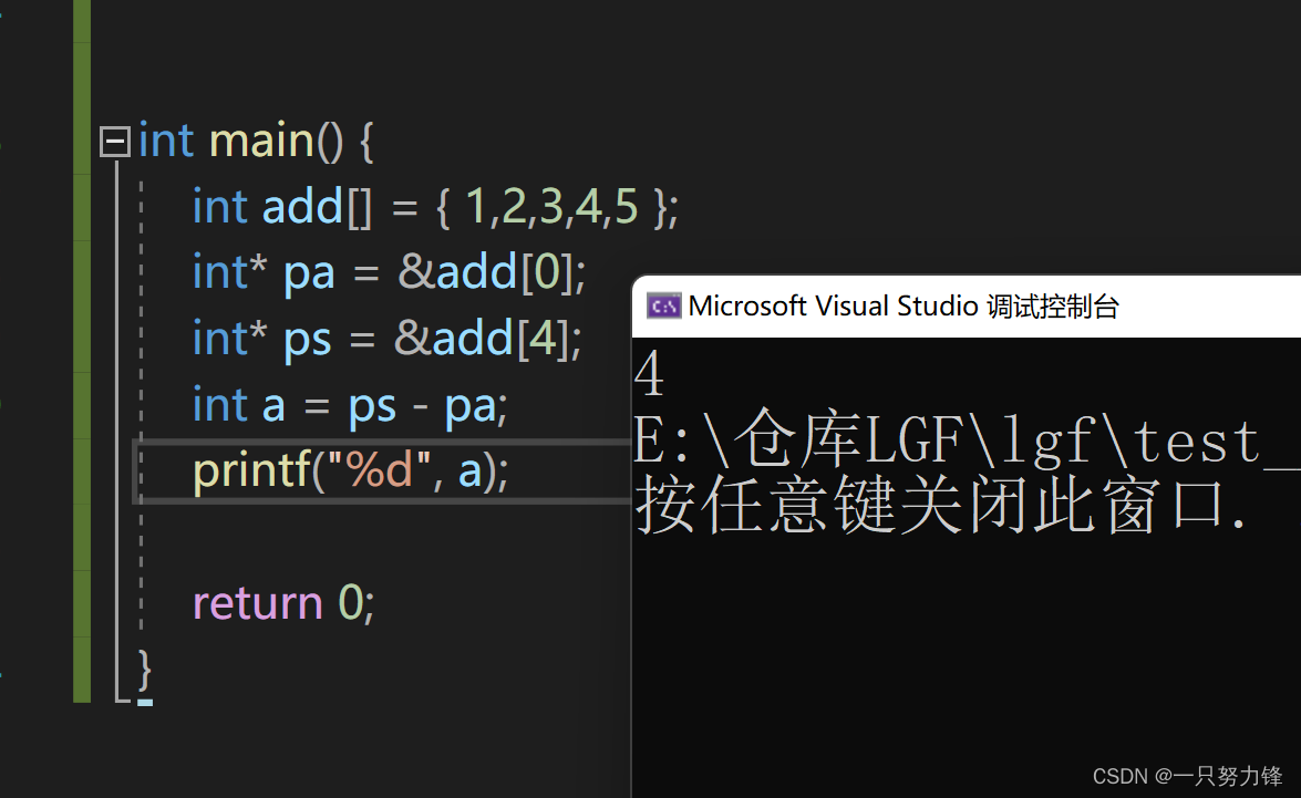 从以上代码我们可以看出指针减指针得到的是两指针所存地址之间类型空间数