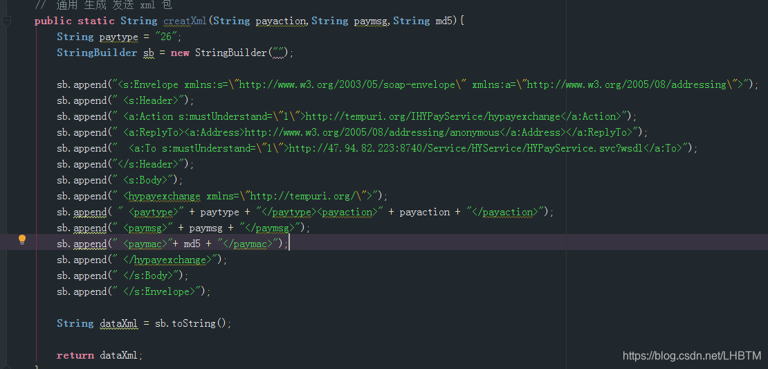sb.append(" <a:To s:mustUnderstand=\"1\">http://47.94.82.223:8740/Service/HYService/HYPayService.svc?wsdl</a:To>");