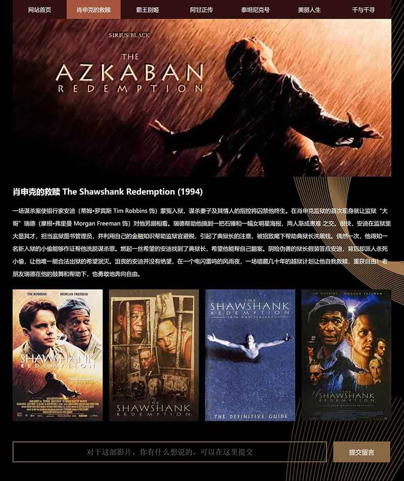 共6个子页面,每个电影子页面都根据电影海报大图的色调制作了不同颜色的导航栏目,通过导航可以返回首页或者进入其他子页面。每个电影子页面都包括导航、海报大图、电影介绍、以及四张电影海报图。电影介绍子页面底部还简单制作了电影评价表单。