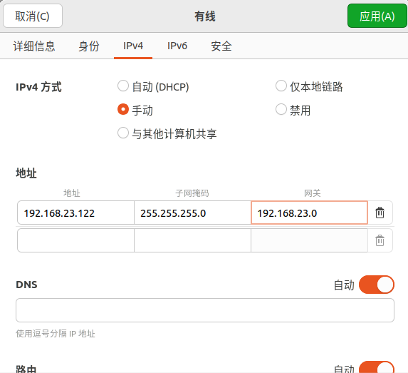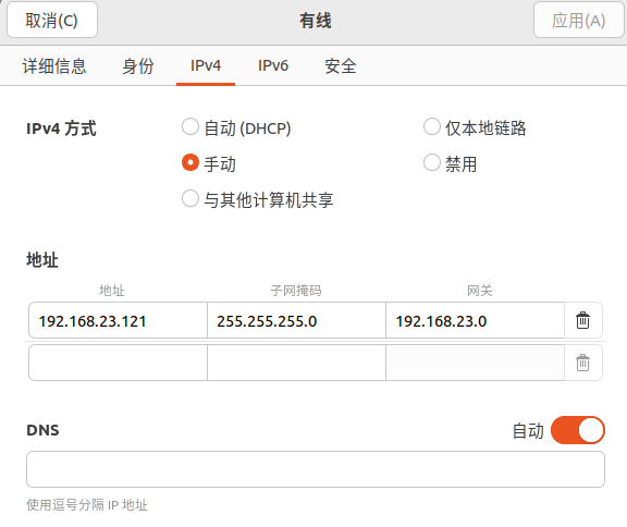 这里我的虚拟机网络配置都为仅主机模式,同时虚拟机中取消用dhcp自动配置ip,而选用ipv4手动设置为192.168.23.121和192.168.23.122,网关和子网掩码都为192.168.23.0和255.255.255.0