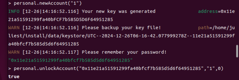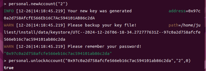 然后在私有链上创建用户并解锁用户账户(交易时必须要解锁)