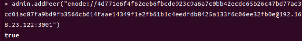 然后准备连接两台虚拟机,在目标虚拟机(192.168.23.122)输入admin.nodeInfo.enode来查看enode,然后用另一台虚拟机连接,执行admin.addPeer()指令来连接指令,peercount=1即连接成功了另一台虚拟机。我的两台虚拟机ip分别为192.168.23.121和192.168.23.122,这里我想用第一台121去连接第二台122