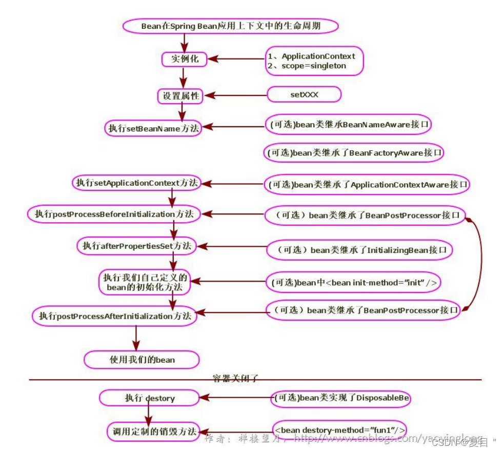 LifeCycle:该接口是 Spring 2.0 加入的,该接口提供了 start()和 stop()两个方法,主要用于控制异步处理过程。在具体使用时,该接口同时被 ApplicationContext 实现及具体Bean 实现, ApplicationContext 会将 start/stop 的信息传递给容器中所有实现了该接口的 Bean,以达到管理和控制 JMX、任务调度等目的。