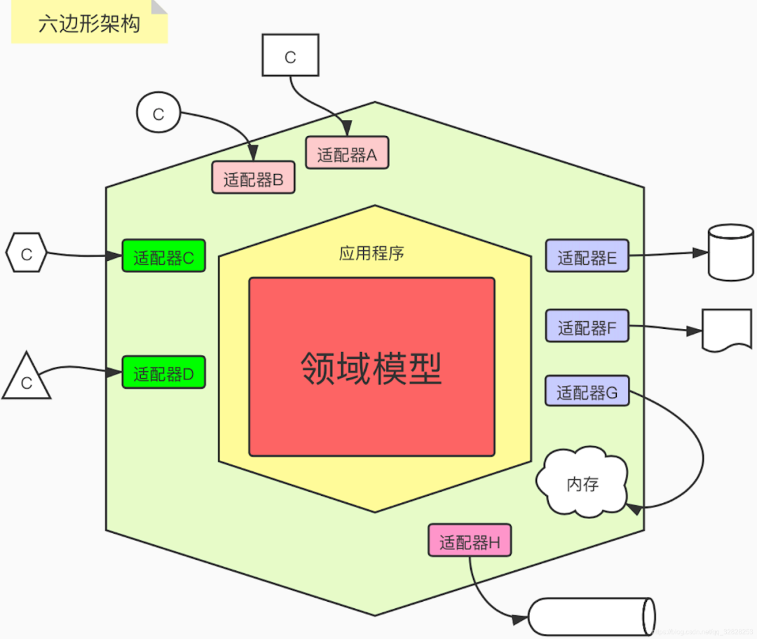 被动适配:指访问存储设备,外部服务等。每种访问就是⼀种端⼝,具体实现是各个具体的中间件。因此端⼝在整个应⽤系统的⾥部,具体实现在系统的外部。每⼀种输⼊和输出都是⼀个端⼝,每个端⼝都有具体的实现逻辑,因此整个应⽤系统的架构就是⼀些列的端⼝+适配逻辑组成,架构图就是⼀个多边形形状。有⼏个端⼝需要根据应⽤系统的具体情况⽽定,只是六个端⼝⽐较形象⽽得名为六边形架构。