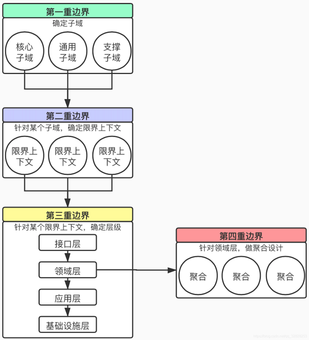 分而治之:DDD通过规划四重边界,把领域知识做了合理的固化和分层。业务有核心领域和支持域、业务域中又拆分成多个限界上下文(BC),一个BC中又根据领域知识核心与否进行分层,领域层中按照多个业务(子域)的强相关性进行聚合成一个子域。