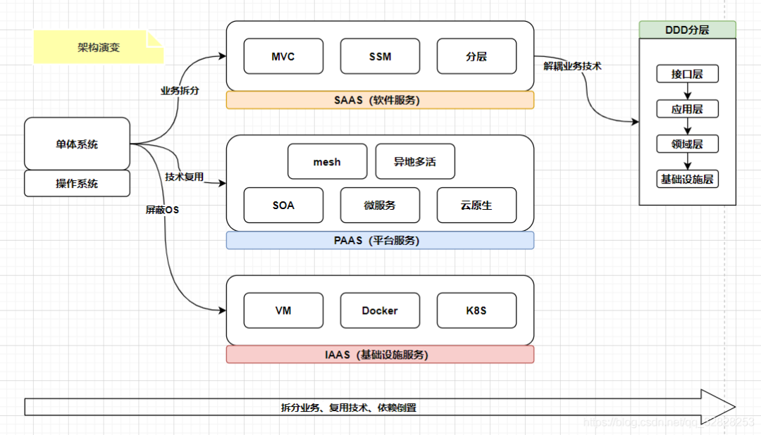 PAAS:随者业务的增长,我们打算分离出一个子系统,但是成本太高,每次都需要从头搭建一个子系统,效率低下。这时我们就抽取除了一些通用技术,比如mesh、SOA、微服务等方式来隔离系统,且对通用技术复用来快速搭建一个系统