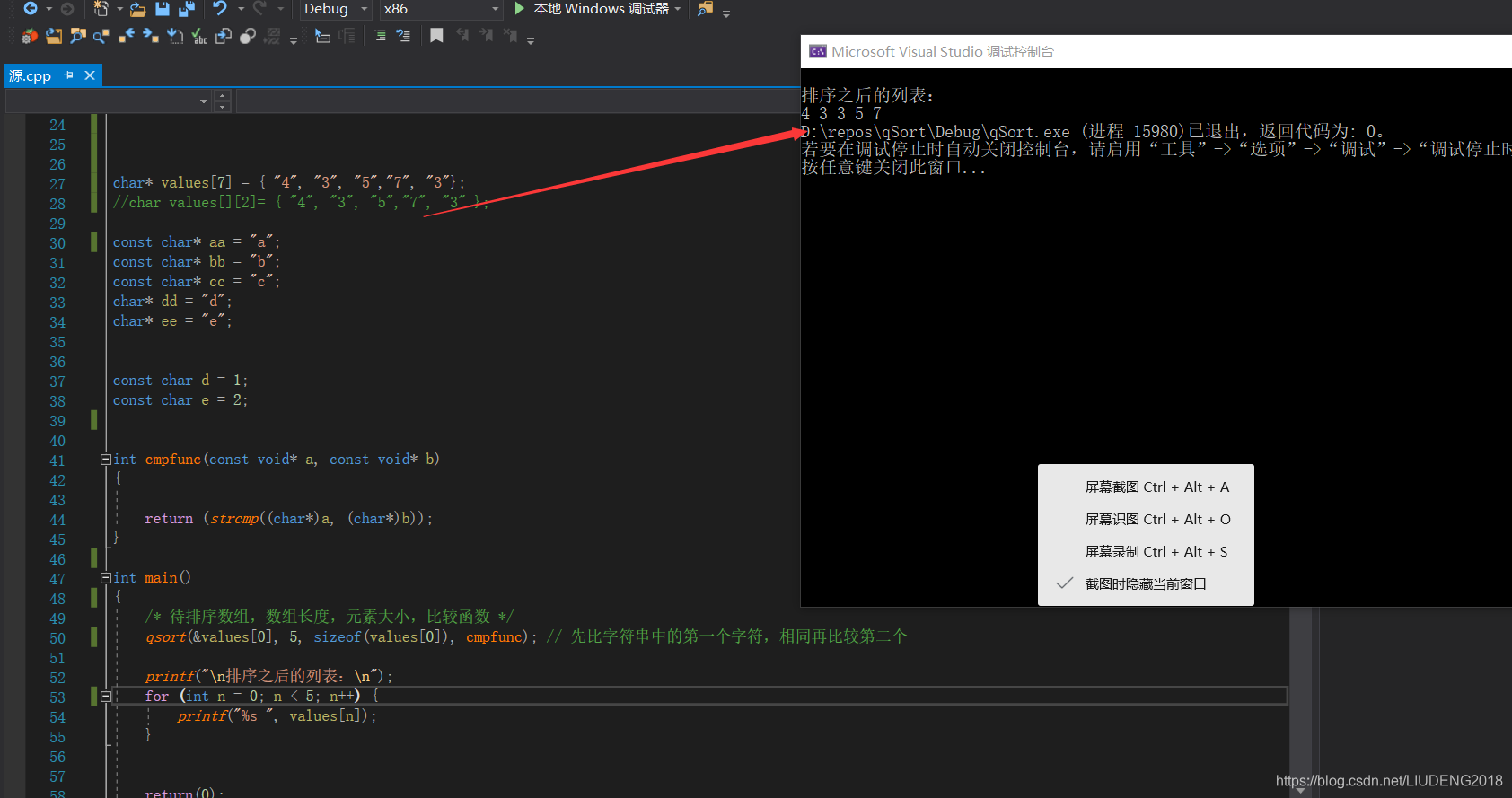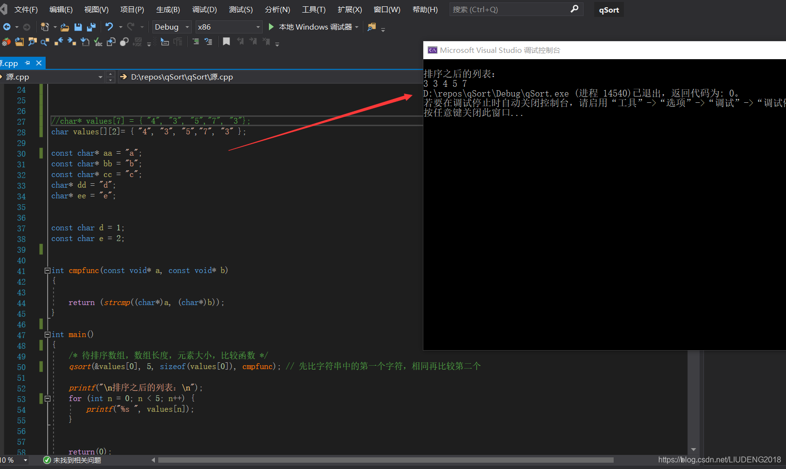 为什么调用qSort排序,两种定义字符串数组方式的出来的结果不一样呢?